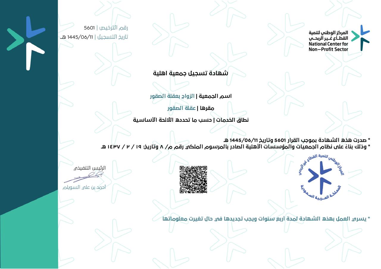 جمعية الزواج بمحافظة عقلة الصقور هي جمعية أهلية مسجلة رسميًا لدى المركز الوطني لتنمية القطاع غير الربحي برقم ترخيص 5601 وتاريخ تسجيل 11 / 06 / 1445 هـ، ومقرها في محافظة عقلة الصقور.